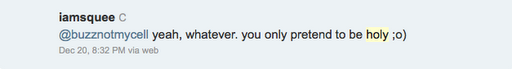 ** Disclaimer to the disclaimer: Kimpants did not promise me puppy pictures in any capacity to talk about her or her project. That was all a lie. I am not a good person from time to time. C told me that the other night. I can’t seem to find the tweet right now. Something about me being Holy or something. I will have to look into where that one went. Found it….