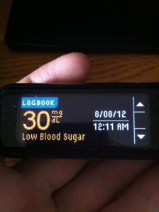 Anyway, it is about 10:30 and I am tired and start my Brian it’s late routine go to bed. So I try and try and try. I just can’t really fall asleep. I know I had Iced Tea so i figure it is that. I read for a bit, try to sleep, still nothing. Now I am getting annoyed with myself. I may have dozed for a bit but around midnight, I am still tossing, in fact I was all over my bed. That is when I say to myself look at Beepy. So I do, he is telling me I am 69 so I am like good, all is according to plan. Ice Cream should be kicking in at some point. I roll over to sleep again. Now I start having a conversation with myself. Please don’t ask me what it was I can’t remember. However, something I thought must have triggered my mind to be rational for a second, and it said “Brian something isn’t right. test” I was all ???? and I heard it again “TEST”. So I roll out of bed and test, 5,4,3,2,1… 35. Wait what!? New finger, 5,4,3,2,1… 30. Oh good, I’m low. Back to bed.