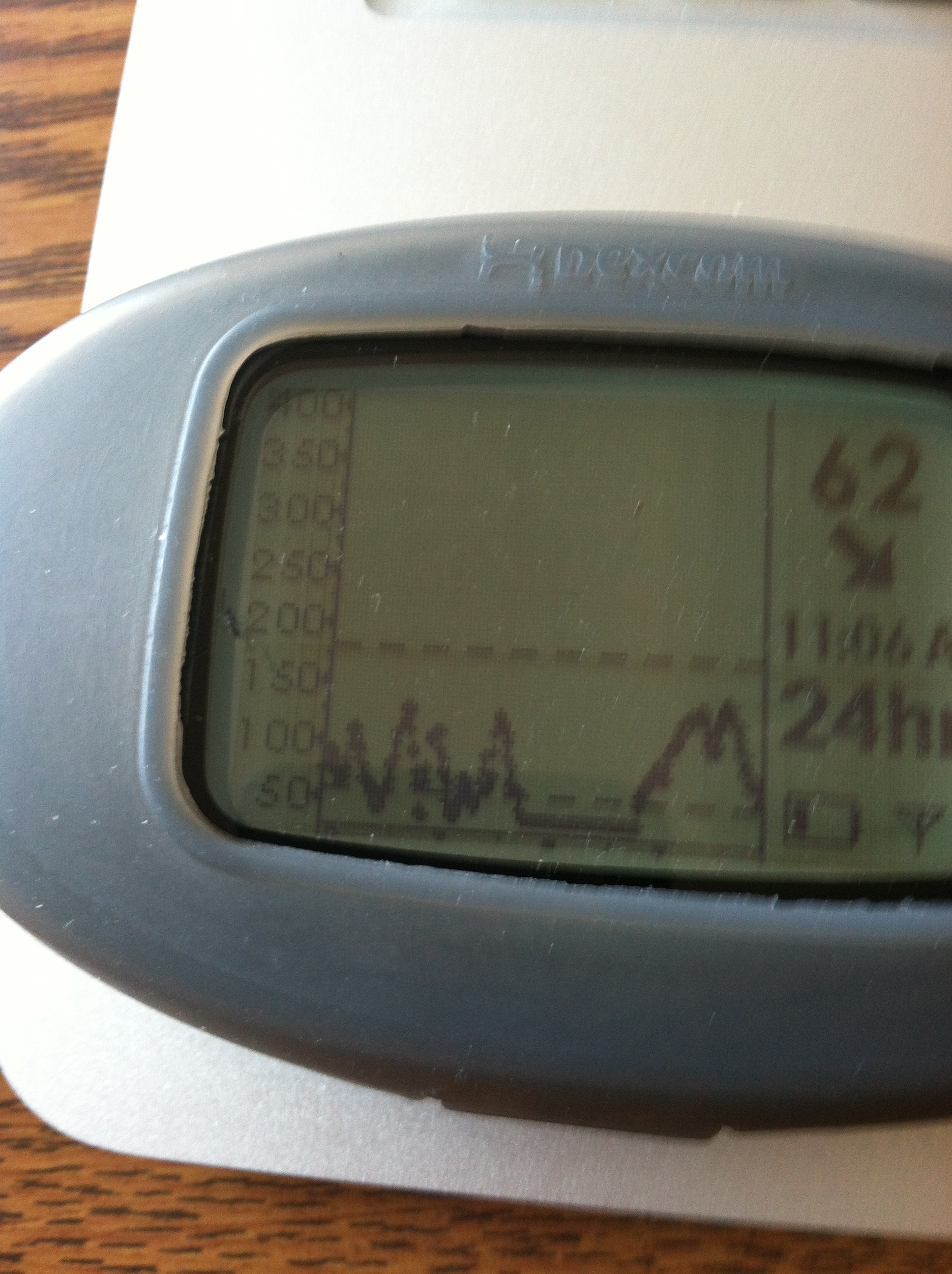 I started my run with my iPod, my Level in one pocket, and a gel in the other. Not to mention the paper towel to blow my nose when I start to snot. (Funny thing I always start my runs with paper towels in my pocket, however 90% of the time when I got to use them, they are no longer in my pocket, what the fructose is that about?). The run was good. I mean two days of running, I was a bit sore, but I ran out the pain and managed to skip one of my breathe catching walks. That was good. While I run Beepy and I stay pretty well connected, maybe every 5 – 7 minutes I will check to make sure I am not tanking. Well as you see on the graph, that did not happen this time. The picture hardly does it justice. All of a sudden I go from 138/94/77/44 all with the scary down arrow, thankfully no double down arrow.