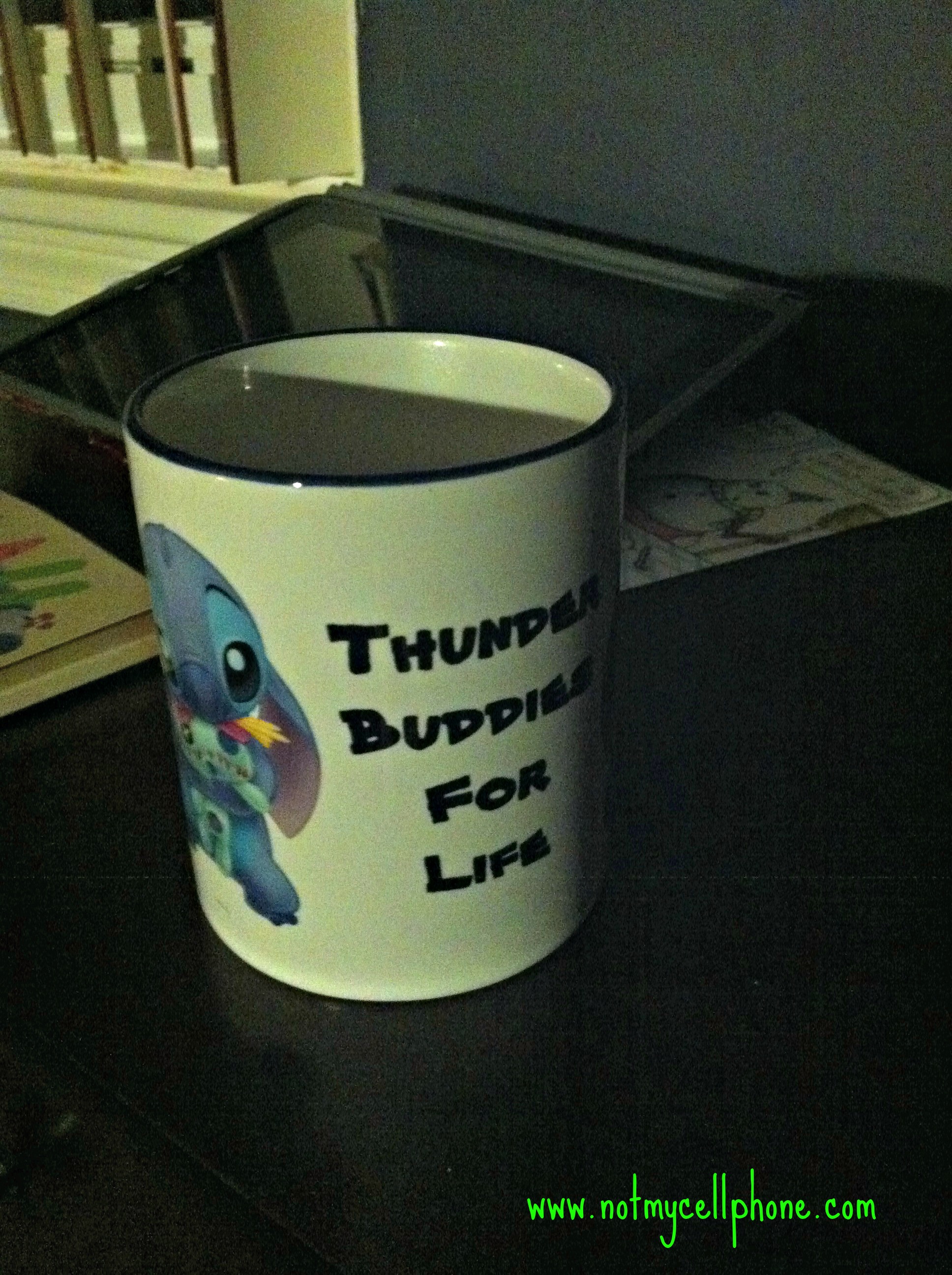 Why is this the greatest gift ever? Well you have to know me, but also know this, the greatest quote in the world. Well maybe not the greatest quote ever, but one of that every time I use it, I smile and now I have an even greater reason to quote it. No one else will ever have a mug like this. Stitch and a “Thunder buddies” quote is amazing experience!
