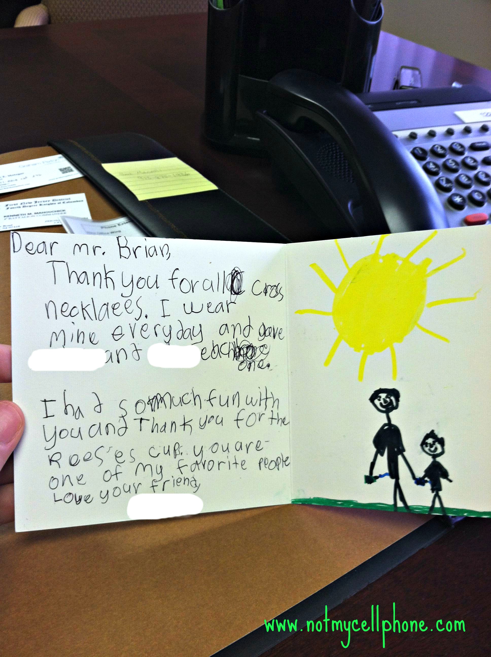 Obviously the card was slightly amended, but you get the gist. Tina had mentioned that Sugarboy had commented on the cross that I wear and how he really liked. This conversation stuck out in my head, while Tina did say she kept meaning to get him one from the Christian Family Store, I figured, hey I have an in here and sent a few his way. Figuring he could keep them all, plus two of the ones I had picked were size related and well Sugarboy is a tiny child so I did not want to send him a huge disproportionate cross to his body size.